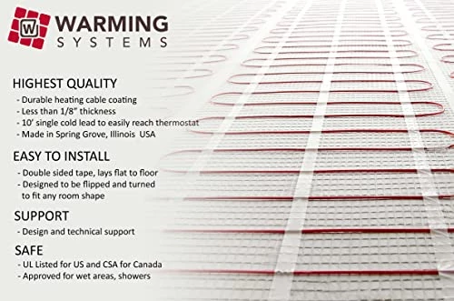 My wife and I put together a bathroom basement. We used this product to keep the floor warmer (we created a tile floor).We installed per manufacturer instructions, slab, then cerazorb, then heat cable, then thinset, then tile.This product gets 4 stars for a couple of reasons1) The floor does not get that warm. The highest value seen by the temperature sensor is 74 even when the thermostat is cranked much higher.I did measure the resistance after installation and there was no difference, so my unit should be not damaged. Also the power consumption on this 15 foor segment is about 240 watts, which is not that much. I suppose I should not have expected much heat with such a low energy consumption rate2) The thermostat configuration is non-trivial and the manual does a poor job explaining. I think Warming Systems should provide documentation on how to configure the thermostat for the system you bought.1st Picture: Heating Cable on top of cerazorb2nd Picture: Laying thinset and tile over heating cable3rd picture: Thermostat mounted on wall