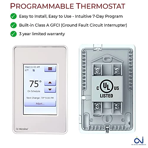 - OJ MICROLINE’S UDG4-4999 TOUCHSCREEN PROGRAMMABLE THERMOSTAT – Offers a sleek, modern design with intuitive control, making it easy to install and easy to use. The 120 Volt, 15 amp thermostat includes an integrated Class A GFCI (ground fault protection). Features include: Dual sensing(AF), Power logging, Child lock, self-learning & more. The 7-Day Program Schedule provides maximum comfort, while reducing operating costs. Includes a 3-year Factory Warranty and are cULus approved for USA & Canada