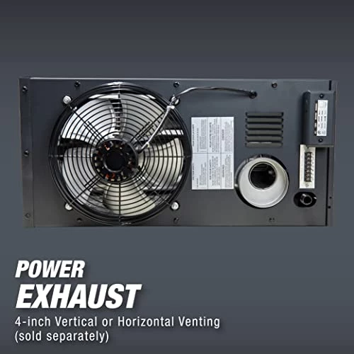 - Powered exhaust allows for vertical or horizontal venting